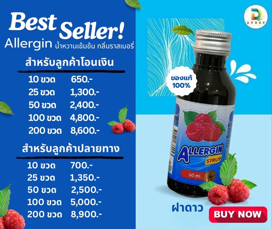 สินค้า Allergin น้ำหวานเข้มข้น กลิ่นราสเบอร์รี่ สนใจสั่งซื้อสินค้า เพิ่มเพื่อนหรือกรอกเบอร์โทรเพื่อสั่งซื้อสินค้า เบอร์โทรศัพท์ *ป้อนเบอร์โทรฯ 10 หลัก0 / 10กดสนใจสั่งซื้อสินค้า